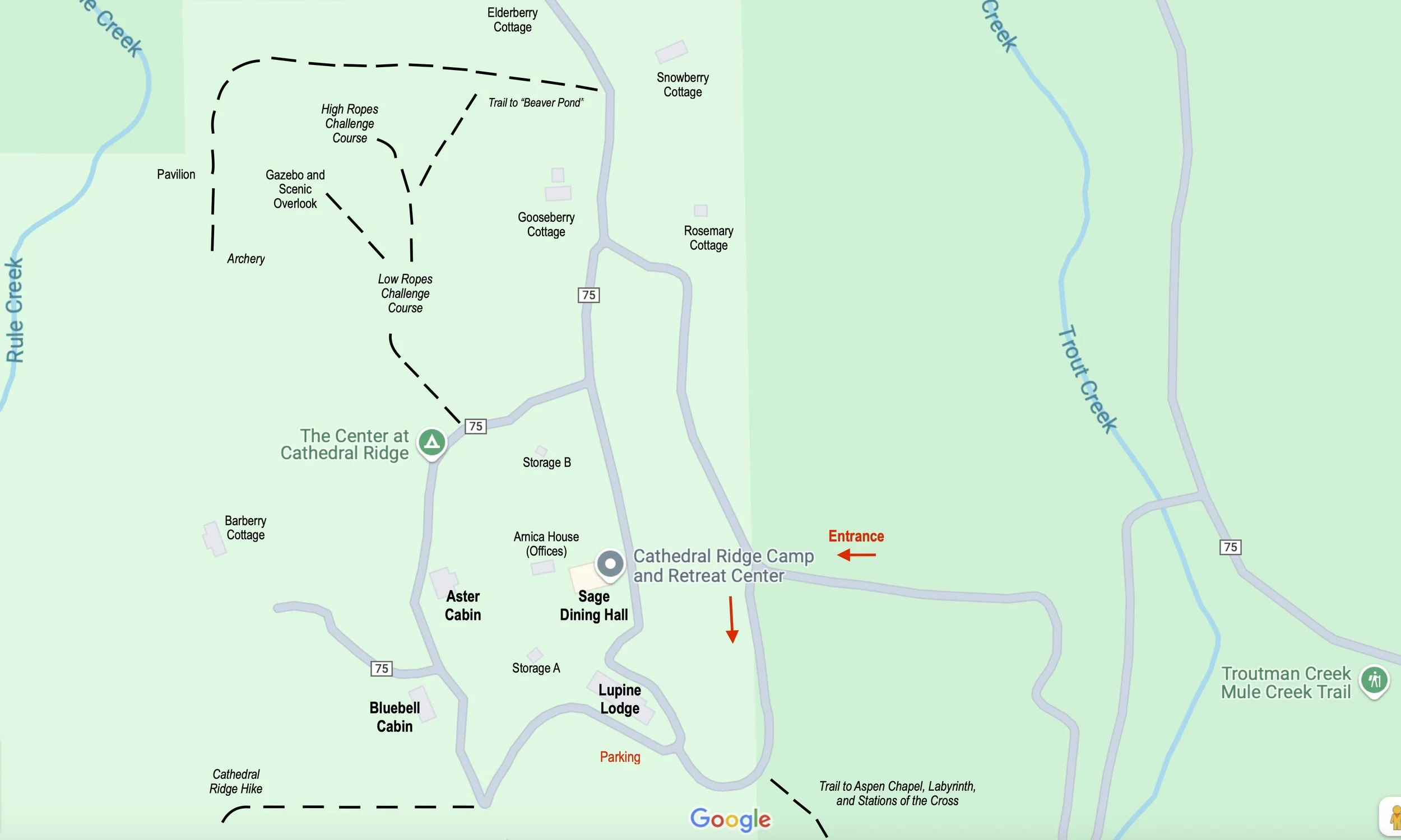 The Way of the Cross has two entrances, one at Aspen Chapel and one at the Ridge Trail Head. Both will take you into the Stations of the Cross, which are sheltered by an abundance of trees. Meditate, pray, reflect, or simply enjoy communing with nature by walking this beautiful trail. Each station offers a serene, spiritual destination. Just follow the dark green blazes and station icons. Prayers for the stations can be requested from Cathedral Ridge staff.